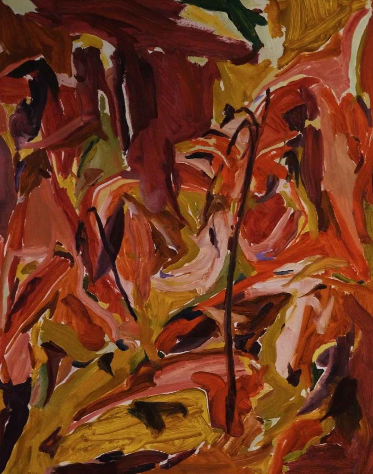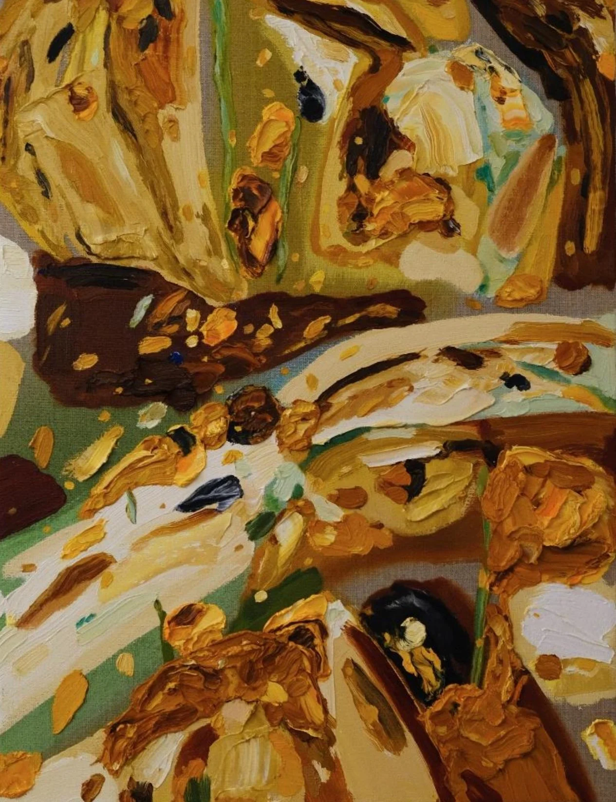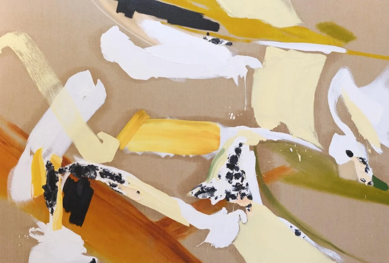 Solenne Fabre (*1995, Francia) ha studiato all’Ecole des Beaux-Arts di Parigi nella masterclass di Tim Eitel. Ab- bastanza sorprendente poiché Tim Eitel è noto per il suo realismo figurativo e la pittura di Solenne è lontana da qualsiasi tipo di figurazione. Le sue composizioni astratte di colore e forma esplorano un universo vegetale. Fiori che sbocciano, paesaggi aridi: bianco, marrone, ocra, verde e marmorizzazione si mescolano a esplosioni di colore brillante, spesse pennellate dominano il suo stile. L’astrazione di Solenne ha una componente figurativa forte ma morbida e i suoi dipinti sono la versione contemporanea del plein air francese.
